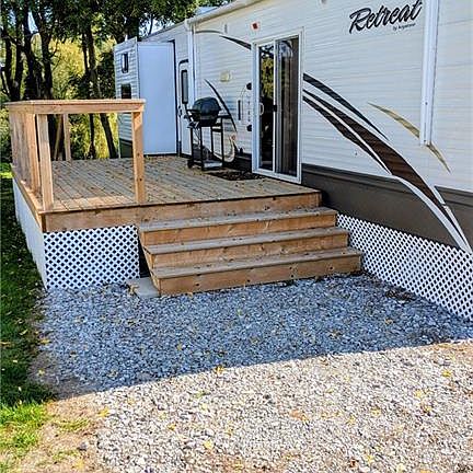 This 2014 39 foot Keystone "retreat" mobile home is in excellent move in condition and ready for you to enjoy living near the lake in the summer. Spacious kitchen with gas stove, fridge and microwave, spacious main bedroom with lots of wall cabinets to store all kinds of stuff you'll need for your days at the "course." The second bedroom features 2 pull out bunk-beds or use as a spare room with all kinds of possibilities. It even has 2 bathrooms. This unit sits on a leased lot at Stark's Golf Course in Port Rowan, what better place to spend your summers than a golf course. The owner is offering immediate occupancy, allowing you to get ready before next summer. Check this one out today.