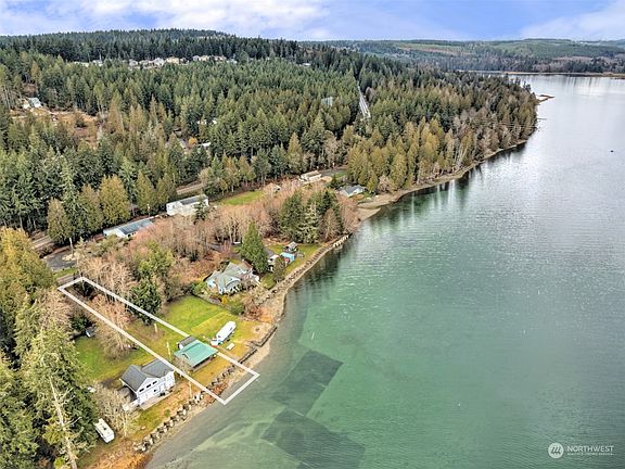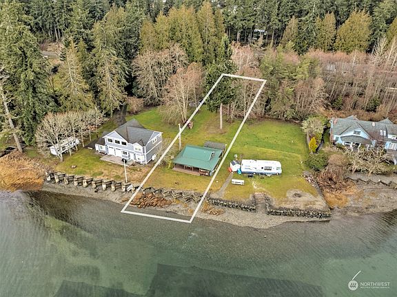 Get ready for summer & lots of future fun! This is a very cool cabin located on about 60+ feet of very low bank frontage on beautiful North Bay just a short walk from Allyn. It has an awesome beach that extends about 40 feet out past the bulkhead. It is loaded with "cute" & has a great yard. Includes 2 small bedrooms, a full bath, an eat-in kitchen & a cozy living area. Plenty of windows with views up & down North Bay. The wrap-around decks are fully covered so being outside all the time is easy to do. Very low maintenance with cedar shingle siding & a metal roof. It also includes a 1 car/boat garage with overflow bunks built in. The yard is a big grassy area that would be perfect for volleyball or a cornhole tournament. Hurry fast!