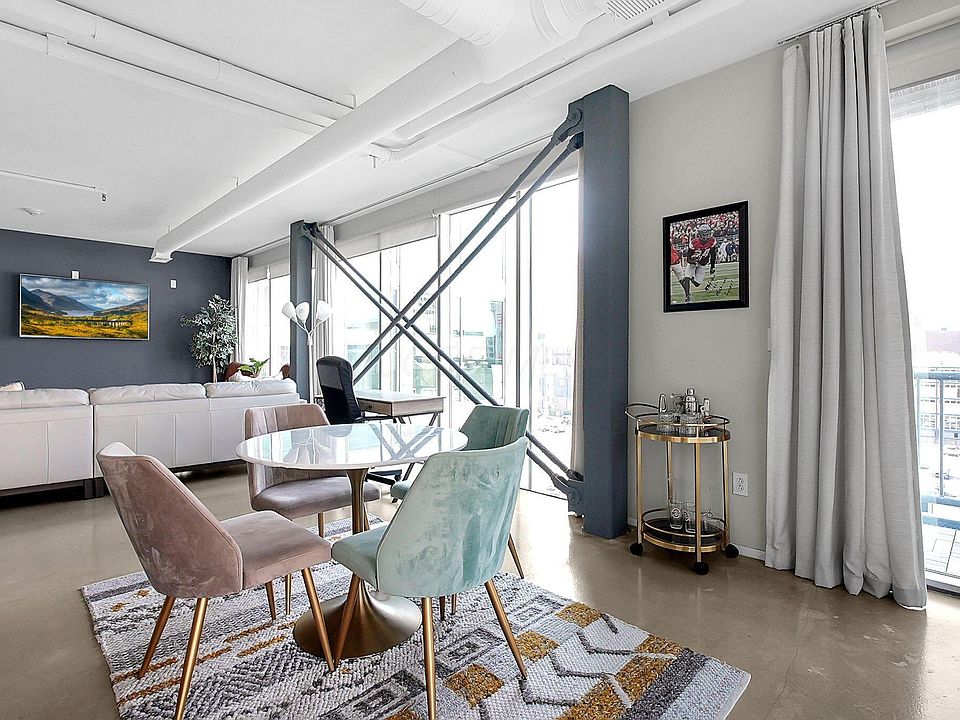 Bright and airy open-concept living space, featuring sleek finishes and large windows that flood the home with natural light. The kitchen boasts contemporary appliances and ample cabinetry, ideal for both everyday meals and entertaining. The spacious bedroom offers a serene retreat, while the updated bathroom ensures comfort and elegance.