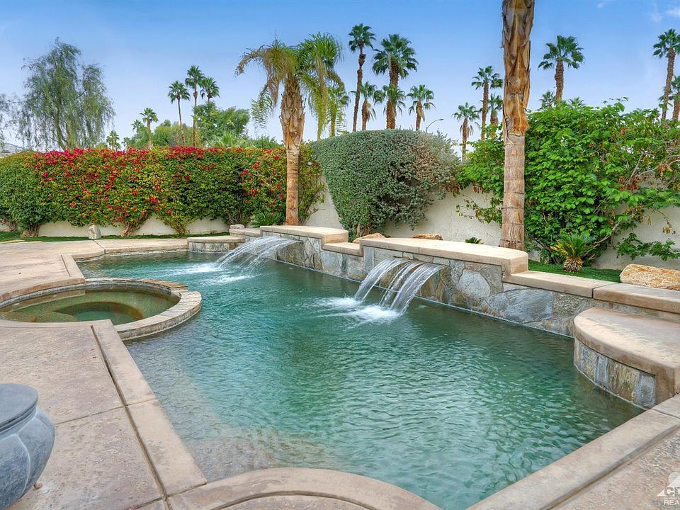 Beautiful 4 bedroom, 3 bath pool home in the heart of Palm Desert. Enter through the double leaded glass doors into formal living and dining room that features faulted ceilings and leaded transom windows, making the area light and bright. Kitchen has slab granite counters, full granite backsplash and island with sink. Kitchen opens to family room with fireplace and media center. Master bedroom has French doors to rear yard and dual walk-in closets. Master bath has dual sinks, sitting vanity, Jacuzzi tub, walk in stone shower with dual showerheads. Curb appeal includes custom flagstone driveway and courtyard. East facing rear yard features Saltwater pool with pebble Tec finish and flagstone trim with spill over. Rear yard also features custom built-in BBQ and large side yard with turf. Surround sound. 3 car attached garage with AC and tons of Storage. Attached Casita in front of home.
