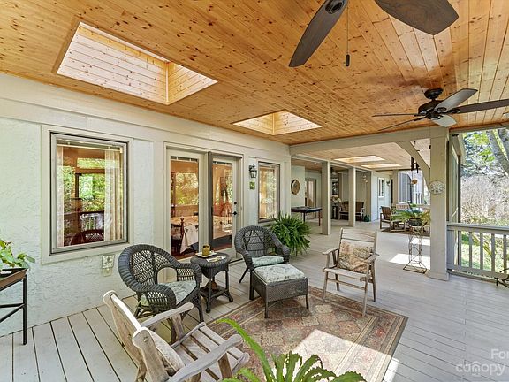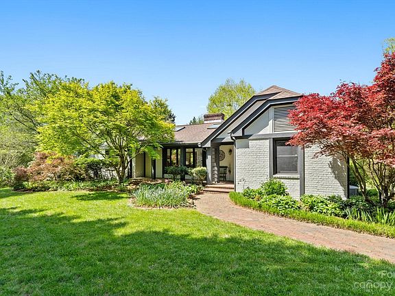 Discover the allure of this spacious, elegant home on a beautiful lot with mature landscaping. Nestled among lush gardens, it exudes charm and tranquility. Cozy up by the fireplace in winter or open the French doors for 3-season living on the expansive screened porch. Skylights bathe the home in natural light. The main-level primary suite opens to the outdoor living area. The renovated kitchen features Dolomite countertops and plenty of work space. Office or additional bedroom on the main provides flexibility. The lower level offers 2 bedrooms, a full bath, and a large living space opening to a beautiful brick patio. Potential for a mother-in-law suite or rental. This large, deep lot offers privacy, outdoor beauty, and great location, all bordering the 11th green of the Country Club of Asheville's golf course. Minutes to the Parkway, shopping, and downtown.