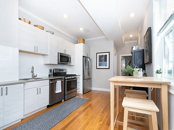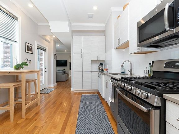 OFFER ACCEPTED, OH CANCELLED! 1100SF+ Penthouse level amenity-filled Eagle Hill Condo Unit! Great bones in this 4 bedroom/ 2 bath classic brick row home unit, 2 train stops to Downtown Boston! Light floods in through a skylight as you enter the unit, opening into the living room, which is flanked by two street facing bedrooms, currently used as an Office + Peloton room. Off the hall is a spacious bathroom w/ custom shower/ stackable laundry, across from cute deck/ stairs to roof. Spacious kitchen features stainless appliances, coffee nook, European- style cabinets and Quartz counters. Two spacious bedrooms in the back have double closets, and share a full sized bath w/custom vanity and bathtub. 360 degree views of Harbor, City, and Tobin Bridge welcome you on the expansive common roof deck with included furniture... and the common yard is easily maintained with artificial turf. Deeded storage room in the basement. Be a part of thriving Eastie~