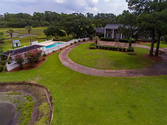 LUXURIOUS PRIVATE ESTATE on four acres just ten minutes to downtown. Set amongst a scenic landscape of lowcountry countryside, this traditional antebellum style home offers the ultimate haven for privacy and relaxation. This home has undergone an enhancement and renovation and sets the bar for luxury living in the Lowcountry. Iron gates and brick walls are framed by a bounty of azaleas, palms and magnolias to reveal a private driveway which leads guests to the main house. The home encompasses 7477 square feet of interior space with dual master suites, three additional bedrooms, five full baths and powder room, over two levels. The entrance and interior details, such as wood floors, high ceilings and fireplaces, reflect an era of traditional elegance. A grand living room and dining room with crystal chandelier along with three more rooms offer numerous spaces for entertaining. The large updated kitchen has been outfitted with Thermador cooktop, dual Dacor wall ovens, Fisher Paykel dishwashers, granite countertops, and custom cabinetry. Wraparound porches host views of Coburg Creek, marsh, and private freshwater lake. Beautiful arbor leads out from the house to a lovely pool and pool house. Short dock on Coburg Creek for crabbing, paddle boarding and kayaking. Brand new roof. Interior freshly painted and new carpet installed. Recreation, entertainment and lowcountry living make this estate unforgettable.