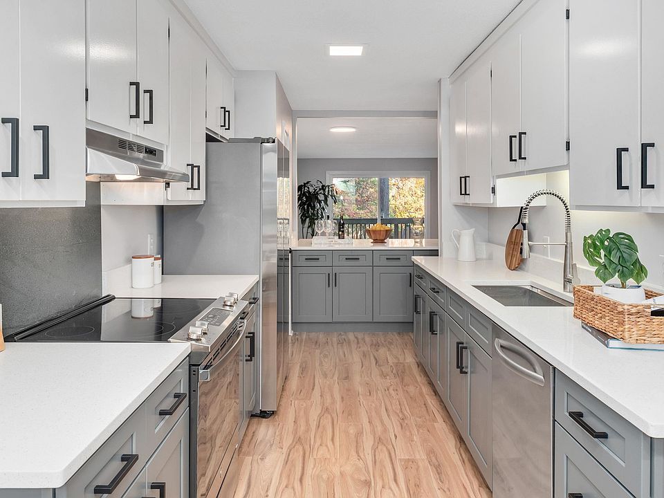 Magnificent 3-bedroom end-unit Townhome in the desirable Village West Neighborhood. Step in through the inviting foyer to a fully renovated home. Brand new flooring throughout the whole house. Fully refinished kitchen with stainless-steel appliances, high quality quartz countertops and dine-in bar area. First floor features a guest bedroom with, ample shelves, and storage space. First floor full bath with newly tiled shower, new vanity, and quartz countertops. Second floor with upgraded new carpeting throughout, 3 gorgeous new vanities with quartz countertops and a full-sized tub. Two spacious bedrooms with ample closets complete the 2nd floor. This sun-filled home features sky lights throughout and a private deck in the back. This quiet, wooded neighborhood right on the public bus line, and is walking distance to Bolin Creek trails and Umstead Park with volleyball courts. Walk or bike to downtown Chapel Hill with all the restaurants and cultural amenities. Community also features swimming pool and sports facilities. Make this beautiful house your next HOME!