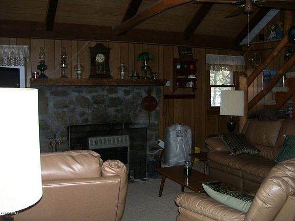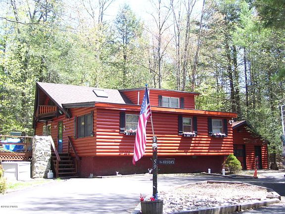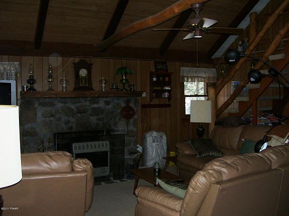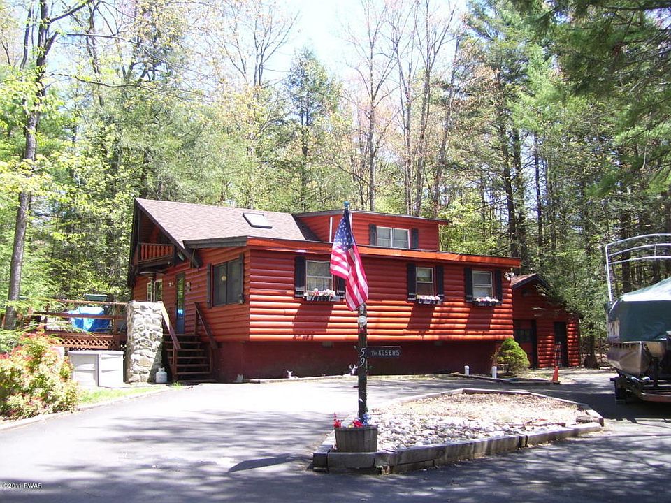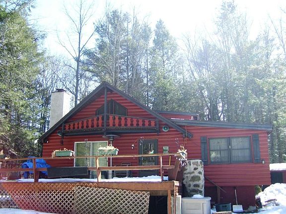 Located on a corner lot in the prestigious community of Woodland Hills, this 4 bedroom, 2 bath log sided home features an open floor plan, master suite, spacious party deck with stone BBQ, 1 car garage, large shed & paved driveway. Includes a boat slip on Lake Wallenpaupack. A great value & a must see property!!