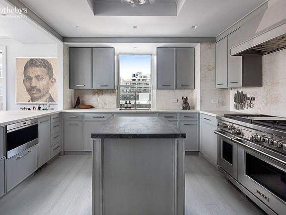 The magnificence of this home is apparent from the moment you arrive. Upon entering you are greeted by an impeccable renovation and the dazzling New York City skyline. The comfortable living room showcases a wood-burning fireplace surrounded by a custom crafted Chesneys fireplace mantle. In the style of loft living, the living and dining room seamlessly connect. The southwest corner dining area is large enough to comfortably seat eight. Adjacent to the dining area sits an ultra high-end windowed kitchen with a large breakfast bar that opens into the dining area. The kitchen is equipped for a true chef with Dekton countertops, 40" SubZero refrigerator, two separate freezer drawers, two Miele dishwashers, a double Wolf oven, a hood that vents out, and endless storage.