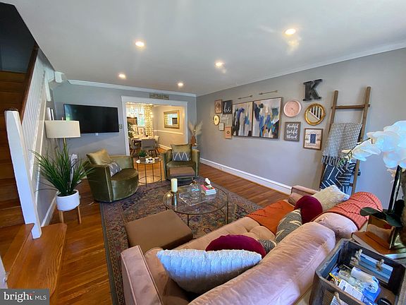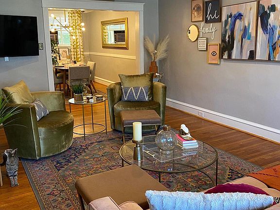 As you walk up to the stone home, you will be greeted with a large, outdoor patio perfect at all times of the day. Through the front door you will immediately notice the open floor plan and wonderful details such as the built-ins next to the fireplace, crown molding, finished hardwood floors, and a fun mid-century dining room chandelier. You'll say ''Wow!'' when you see the professionally updated kitchen featuring 42'' shaker style cabinets, glistening quartz countertops, stainless steel appliances, and a stylish tile backsplash. As you make your way upstairs, you will notice the primary bedroom is spacious and offers good closet space plus lots of natural light. Next to it is the wonderful, updated bathroom featuring a walk-in shower, a skylight, golden fixtures, and lovely tile work. The unfinished basement offers good space for storage, a workout area, or just add an area rug, table, and sofa for a hangout space. The laundry and outside exit to the attached garage access are also located in the basement. There is available street parking along with parking behind the house in the alley. Move right in and enjoy this beautiful home with all of its fine features and beautiful materials!
