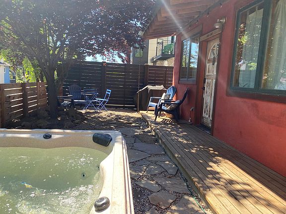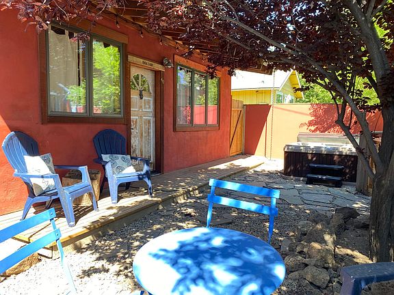Available now for the month of February. This is a fully furnished monthly rental home. Tours are not possible, unfortunately. Here is your chance to experience an amazing straw bale home in one of Bend's best locations! This eco friendly, lofted home is the perfect perch for either work or play in Bend. Located on a quiet street just a block from Drake Park you can walk to coffee every morning, walk to your river float every afternoon and truly experience the relaxing routine of downtown Bend living. Downstairs you'll find the king bedroom, complete with high thread count linens, European bedding and warm floors. The built in dresser snugs right into the stucco and straw bale walls. You'll find the full bathroom down here as well with a tub and shower stocked with earth friendly soaps and shampoos to start off your stay. Colorful tile and creative finishes around the tub will also catch your eye. All the floors down stairs are radiantly heated so your toes will always be happy. A full washer and dryer are also provided. The kitchen and dining room also are the perfect spots to start your gourmet meal, or lounge for morning coffee as you plan your day in Bend. The wood stove is is such a treat for cool nights. We'll start you off with a bundle of wood for your stay. Upstairs is the amazing loft space with queen bed and queen sleeper sofa. Bedding is provided for all 3 beds. The loft is completely surrounded by windows so you can truly bring the outside in! We've added light blocking curtains to the upstairs queen bedroom area for a dark an cozy sleeping space. TV and a computer work station, with monitor included, are also located upstairs. The kitchen is fully stocked with utensils for both the cook and the baker. We always supply basic oils and spices for your use too. You'll always be set for making a recovery dinner after your surf, swim or ski! The dining room seats 6 easily. You'll find all the expected appliances (oven, stove, fridge, dishwasher, microwave, toaster) plus more. There is no dishwasher in this home. This strawbale home is very well insulated and has a powerful ceiling fan in the loft and portable fans in the sleeping areas. There is currently no A/C in the home. It has a passive solar design that is meant to keep the home home cool in the summer and warm in the winter. Bend also has nights that dip into the 50's on a regular basis, so opening up the home in the evenings is the perfect way to cool off. Don't miss the little outside dining area and your own dedicated BBQ chairs for enjoying our pleasant afternoons! This is a quintessential Bend location! All utilities included, 1 alley parking spot, 1 street parking permit provided PETS PERMITTED with $200/month non refundable pet fee NO SMOKING NO PARTIES
