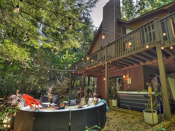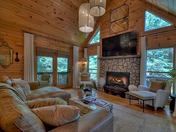 Tucked away in the forest, this treehouse feel cabin is a true charmer. Sounds of Fightingtown Creek in the distance and cool mountain breezes create a cozy feel in this 4bedroom/2 bath rustic cottage with modern flair, located just minutes from historic downtown area, the spacious layout offers separate sleeping spaces, lovely loft area, large open living area with sky high ceilings and warm stone fireplace spills onto oversize covered porches and open decks surrounded by the mountains, plentiful cabinetry & stainless appliances, darling dining area, movie/media room, newly remodeled and tastefully furnished for a wonderful retreat or fabulous vacation rental among the hemlocks.. Nearly all paved and easy access, turn key and ready to enjoy!