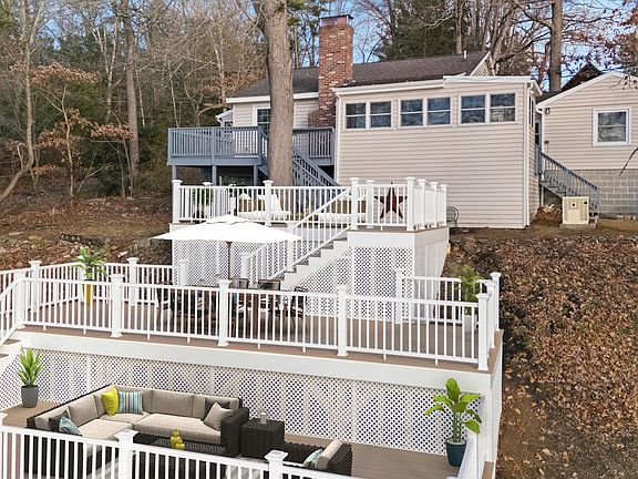 Brand-new multi-level TimberTech decks spanning roughly 800 square feet anchor the back of this fully furnished and beautifully renovated lakeside home on private Witches Woods Lake, creating an expansive outdoor haven for hosting, unwinding, and breathing in the calm of true waterfront living. With breathtaking views and direct frontage, the home has been thoughtfully updated in recent years with a modern granite kitchen, stainless appliances, updated flooring on the lower level, new septic system, and new mini-split heating and cooling systems for year-round comfort. The main level offers an easy flow between the kitchen, dining area, and living room, along with two comfortable bedrooms and a refreshed full bath. A sun-filled enclosed porch extends the living space and opens directly to the new decks, creating simple indoor-outdoor connection throughout the seasons. The walk-out lower level adds versatility with a spacious recreation room that could function as an additional bedroom, a second full bath with laundry, and direct access to the yard and shoreline. A one-car garage, breezeway, and multiple storage areas add everyday convenience. With kayaking, swimming, boating, and lakeside quiet just steps from your door- and with every major improvement already complete- this is peaceful, uncomplicated waterfront living where everything just feels easier.