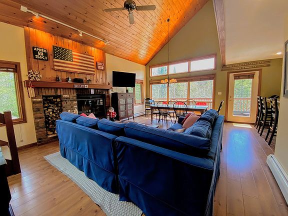 Perched on a ledge across from the Bretton Woods ski area, New Hampshire's largest resort, this home welcomes you with beautiful views of the ski slopes and a bright, open feel. The property features a large deck and backyard, perfect for enjoying the fresh mountain air, and a cozy fireplace for those occasional rainy days. With ample space, your family may never want to leave. The home is located just down the road from the Mount Washington Hotel and the Bretton Woods Ski Area base, offering endless recreational options. The home boasts a country-style kitchen, fully stocked for all your cooking needs, complete with a drip coffee maker, granite countertops, and a breakfast bar that seats four. The sunny open concept dining and living area features a large dining table that seats six and comfortable furniture surrounding a wood-burning stone fireplace. Enjoy views of the Bretton Woods ski slopes from every window and access to the back deck for additional outdoor dining. The lower level offers a second living area with a TV and ping pong table. The property offers air conditioning, free high-speed Wi-Fi, a cable gaming system, and a DVD player. Linens, towels, and a starter kit of essential amenities are included with your cleaning fee. Trash pickup is included at the end of your stay, with additional pickups available for $10 per pickup. Pool and gym pass program is subject to availability and restrictions set by the resort. Located in Bretton Woods, New Hampshire's largest ski resort, this home is a four-season destination with activities for all ages. Just minutes from the historical Mount Washington Hotel, you can enjoy its award-winning spa, restaurants, and a myriad of activities, including zip lining, rock climbing, river tubing, mountain biking, golfing, and more. In the winter, enjoy downhill and cross-country skiing, ice skating, snow tubing, and dog sledding. Explore nearby attractions such as the Cog Rail, Santa's Village, StoryLand, and the Flume Gorge. This house is located in a quiet, family-friendly resort area. It is not suitable for parties or loud groups. Quiet hours are from 10 PM to 8 AM. Parking is limited to two vehicles at the unit, with overflow parking available nearby. No pets or unauthorized guests are allowed, with a $300 fee for violations. No smoking inside the unit, with a $250 fee for violations. Propane and charcoal grills or any form of open fire are forbidden within 10 feet of the building. Electronic noise monitoring is in use, and violations of these rules may result in immediate removal without refunds. Guests are responsible for any fines levied for violations of local regulations. Check-in is any time after 4 PM and check-out is at 11 AM. Unauthorized early arrivals or late checkouts are subject to a $100 per hour fee.