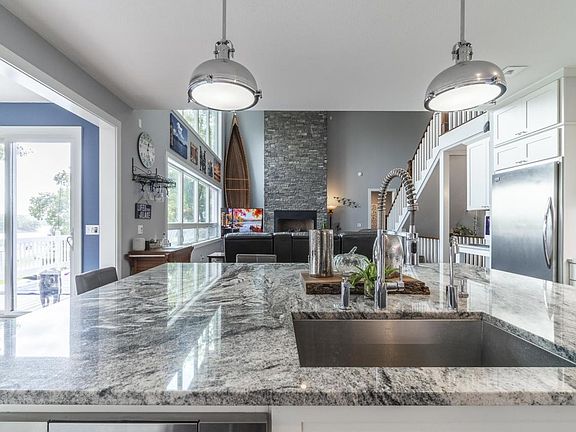 Lakeside luxury in this exquisite home with 65 ft of water frontage on the shores of Lake James. The heart of the home showcases a great room with soaring 18-foot ceilings, a vent free gas fireplace, and expansive wall of triple pane windows ensuring fantastic views. Natural light floods the space, highlighting the stunning engineered wood flooring that stretches throughout. The kitchen is a culinary enthusiast's dream! It is equipped with commercial grade stainless steel appliances, wine chiller fridge, an instant hot water tap, and granite countertops. The showstopper is the spacious single slab of granite (9 x 6) kitchen island with built in microwave provides ample workspace, or a fantastic gathering point for entertaining. The ample walk-in pantry (5 x16) with granite countertop and cabinetry is the perfect complement to the kitchen. The adjoining dining room is open to the kitchen surrounded by windows, and a 12 ft patio slider leading out to the 38 x 13 upper deck. The primary bedroom located on the main floor is a serene retreat. A spacious bedroom with a lake view is complete with a soaking tub, a 6 ft walk in tiled shower, water closet, dual vanity with granite, and a spacious walk-in closet with built in storage. Upstairs features 2 large bedrooms with spacious closets, and a full bath with walk in shower and dual vanity. Descend to the walk out basement, where 11 ft ceilings and a kitchenette with full size appliances create the ideal space for entertaining! It features a guest bedroom with a lake view, full bath with heated floors, an additional sleeping room, a den with a view, partially finished storage room, mechanical room and its own access to the garage! The basement additionally features a patio slider out to covered patio. Built with durability in mind, the home incorporates helical piers, Zip system sheathing, fiberglass insulation, and Hardie Board fiber cement siding. There is a full list of upgrades features located in associated documents. As a member of the Lake James Estates association, residents enjoy access to a private boat launch, the sandy beach swim area, and the outdoor pavilion. This lakeside haven strikes the perfect balance between luxury and natural beauty, offering a lifestyle that's sure to make even the fish jealous. Don't let this opportunity swim away!