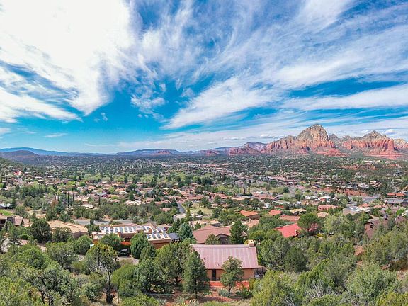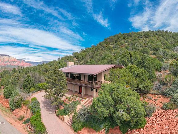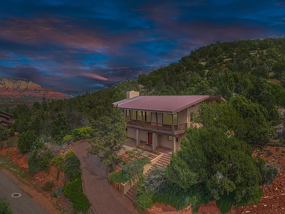 Experience living with mesmerizing sunsets and inspiring panoramic views every day. This home features: vaulted ceiling living & dining rooms with double doors opening to an outdoor front patio overlooking all of Sedona's red rock grandeur, hard wood Maple flooring, floor to ceiling fire place, an upgraded kitchen with corian counter tops and stainless steel appliances. Upper level has the master suite and main bath. The lower level has 2 bedrooms with views, bathroom and laundry room. The back yard has beautiful terraced landscaping, mature trees, tool shed and backs to Coconino Nat'l forest, is close to amazing wildlife trails and red rock hiking pathways. The exterior newly painted, metal roof and home well maintainted. No HOA.See the supplement for more details.