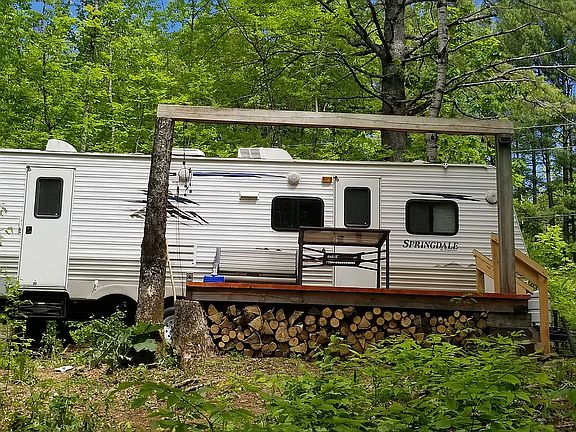 2009 Springdale by keystone. Two large slide outs,sleeps 6. Full bed in rear with two bunks. Tub/shower. Tv,Ac,heat,microwave,3 burner stove with oven. Small open floor plan Cabin with loft. Has grandfathered rebuilding rights. Cabin also has power that is connected to camper with 30amp service. Both camper and cabin sit on (1000ft of water front) with a waterfall into large pool. New 10'x10' deck on camper. Also 8x10 deck over the stream.