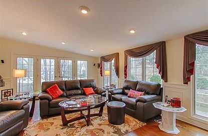 Stunning, authentic Tudor in a quiet, serene neighborhood w/ easy access to NY train. All BR's are en-suite and recently renovated. Eat-in kitchen is a "cook's delight" with top of the line SS app. Large Fam Rm w/ French doors to expansive, private patio. 1st floor office or guest room . Hardwood floors througout. 2 fireplaces located in Living Room & Master Bedroom. Finished base. with full bath and Rec. Rm and Exercise Room, allows flexibility with an overrun of guests. Lovely, wooded property w/ pond offers the ultimate in privacy.