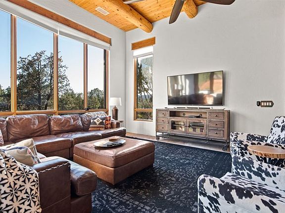 Step inside to an open-concept living space where two spacious living areas are divided by a double-sided fireplace. Warm wood-beam ceilings and expansive windows bathe the space in natural light and showcase the breathtaking Sedona landscape outside. With oversized leather sectional sofas, stylish accent chairs, a Smart TV, and plenty of space to gather or spread out, this home invites you to settle in and stay a while.