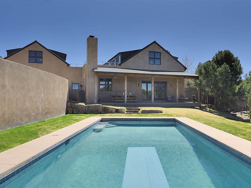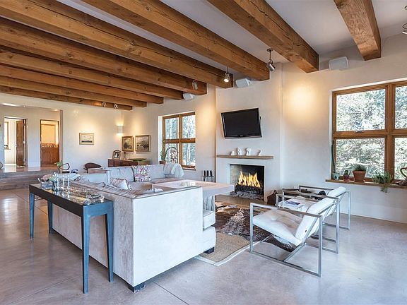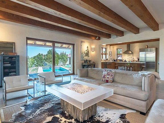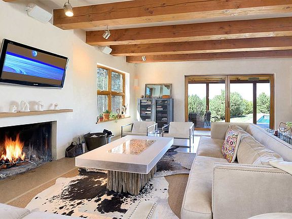Private, contemporary Tesuque home designed by Beverly Spears and built by Burke Denman complete with studio, guesthouse and pool. This private 5 bedroom 5 bath home on over 5 acres with amazing views seamlessly blends Northern New Mexican and contemporary architecture using Rastra construction. The open floor plan is perfect for entertaining with its large living room that has grand ceilings and disappearing glass doors that open onto the portal, garden and pool. A cook's kitchen features a Wolf range, wine refrigerator, walk-in pantry, Sub Zero refrigerator, and more. The large master bedroom has a view deck. There is a studio above the 2 car garage that can be used as an office. A guesthouse has full kitchen, bedroom, living room, and bathroom. Enjoy days and nights outdoors by the pool with private outdoor shower, a tee pee pad that overlooks the valley, shady portals, and firepit. The grounds are beautifully landscaped, and have a private well, plus a Norweco black water reclamation system.