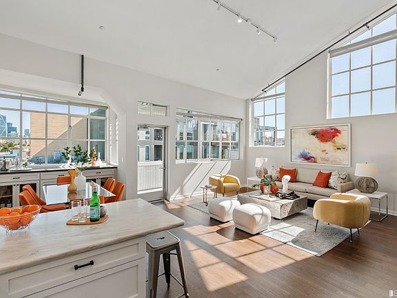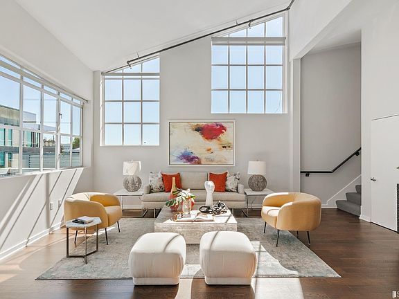 Industrial chic meets modern living in this historic two-level live/work conversion loft with fantastic downtown city views. Situated on a quiet, magnolia-lined street in the heart of SOMA, this dramatic residence boasts 3 bedrooms and 2.5 bathrooms with great city views. The entry opens to a voluminous great room living/dining space with gorgeous hardwood floors, a wall of windows and opens to a spacious, deeded terrace with downtown city views. Kitchen offers stainless appliances including BlueStar range with Zephyr hood, Liebherr refrigerator and Miele dishwasher, custom marble counter and abundant cabinetry. 2 bright bedrooms, one ensuite, both with access to a spacious second deck with city views ideal for large scale entertaining, a updated bath with soaking tub with shower, and laundry closet complete this level. The expansive upper-level primary suite includes new carpet, a wall of windows with city views, a large luxury bathroom with custom tile walk-in shower, and large walk-in closet. Secure building entry with elevator and 2 car garage parking. Ideal SOMA location close to parks, restaurants, and neighborhood cafes. Easy access to shopping, downtown, Yerba Buena Park, and Civic Center, public transportation, and freeways. Photos from previous listing may be altered