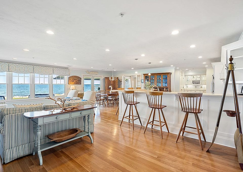 DIRECT WATERFRONT LIVING! One of the best hidden secrets in Plymouth is called Robbins Wharf, a small 26 homes community with 4 acres of waterfront surrounded by 18 acres of conservation land that you can walk, bike or run right into town from their adjacent trails. It's truly a dream of a location, not only it has the ocean views and it has the access to it and a sandy beach to walk! Out of the 26 units there were only 2 that were built to be ONE FLOOR LIVING, this is 1 of the 2. Most units only come with a 1 car garage, this home has a 2 CAR GARAGE. Get ready to say wow as you walk in, you will be greeted by the blue Atlantic ocean. Meticulously maintained hardwood floors and woodwork throughout, with a bright open floor plan you get views from the large entertaining Kitchen which was designed with a large L shaped Island perfect for entertaining, granite countertops, stainless steel appliances, custom cabinetry and blue tile backsplash, it fits the beach theme perfectly. We love the wine bar built right off the Kitchen with extra counter space, cabinetry and a second utilitary sink. Adjacent to the bar you will find extra storage in the pantry. A lovely mudroom bench nook was added as an extra in this space to tie in the flow as you walk in from your 2 car garage. Dining room and Family room are all off the kitchen in the ocean facing side with 4 windows and sliders to enjoy the views. Custom cabinetry and a fireplace can be enjoyed in this space. Off the sliders you will walk out to your own patio with an electronic awning to enjoy some shade on those hot summer days. A den with french doors sits quietly off the open space perfect for an in-home office, reading room, extra guest space etc.. Large owner's suite includes 3 large windows to enjoy the views just as you wake up as well as a second fireplace. Closet space and a well appointed bathroom with a jetted tub, double vanities and a tiled walk in shower complete this retreat space. Your guest bedroom with its own full bathroom can be found as you walk into the unit in the front facing side of the home giving some privacy to your loved ones. Dip your toes in the sand or the ocean from your own backyard, or walk to the many restaurants & shops downtown Plymouth has to offer or simply enjoy the breeze and ocean smell and sound and views from Plymouth Harbour to Bug Light and Saquish. This property has it all, it's a dream, it's THE dream.