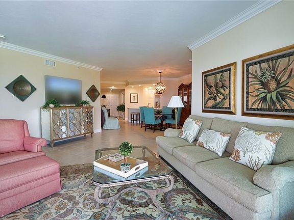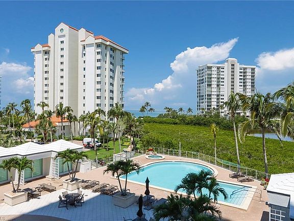 Luxurious high-rise building in Baypointe at Naples Cay! This is a gorgeous 4th floor residence with panoramic views over Clam Bay, Pelican Bay and the Gulf of Mexico with its beautiful beaches! Enjoy peace & serenity from your patio while watching the boating activity or the many birds that make the protected mangroves their home. Privacy abounds in this guard gated community with secure entry features at the building and gated garage parking under the building. Just steps from the beach for a day of sunning, shelling, reading or taking a walk along the miles of white sand beaches & aquamarine blue water along its edges. Other Baypointe amenities include a large heated pool & spa, fitness room, conference room, billiards room, a social room with full kitchen and guest suites. This home offers 2 full bedrooms, a Den, 3 baths and with 2173 sq. feet of living space, plenty of room for your family & guests to visit. Lovely furnishings in light colored fabrics with wood accents. Tile flooring in the living areas, carpeting in the bedrooms, and spectacular views from each spacious bedroom. The Naples Cay community is centrally located to all that Naples has to offer including the Waterside Shops & Venetian Village for shopping & dining, Artis-Philharmonic Performing Arts Center, or Mercato, 5th Avenue & 3rd Street South for downtown strolling and many more upscale restaurants & shops to experience.