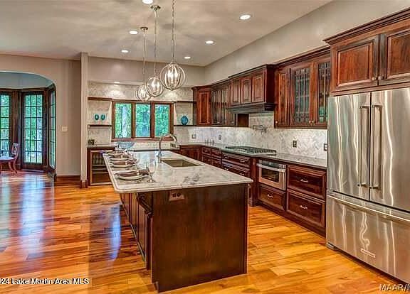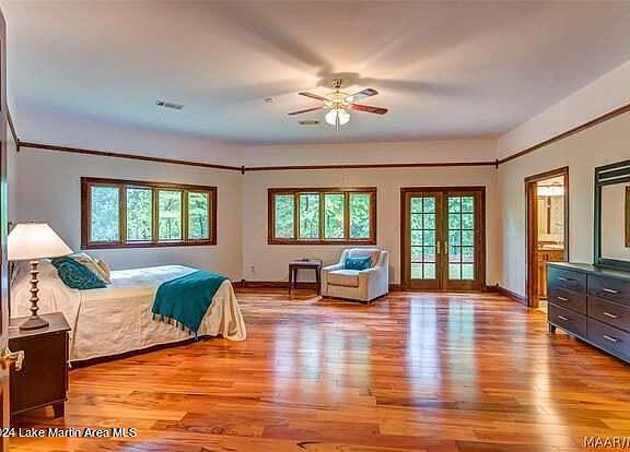 Beautiful 5400 sf 5 br 5 ba home with 3 bay garage .The home has incredible high end finishes and cabinets , Beautiful wood floors and wood trim accent these high end finishes. The home is situated on 16.2 acres of beautiful wooded land. Stacked stone exterior.There are No restrictions on renting home or subdividing land. The home sits high on a hill and has beautiful views of Lake Martin. The Property has water frontage along the Little Kowaliga Creek(see plat) and along southwest corner of the property.(apprx. 200 feet or more)