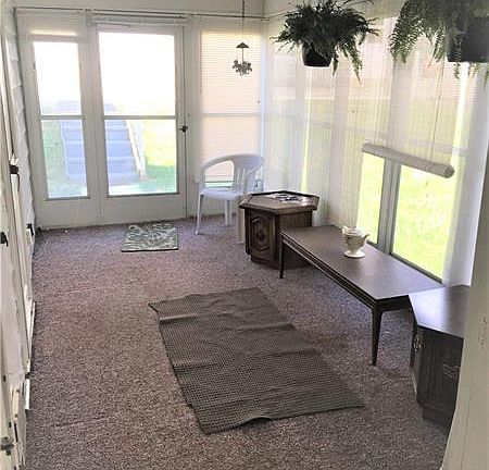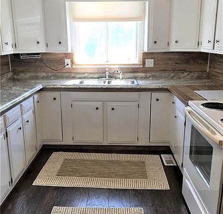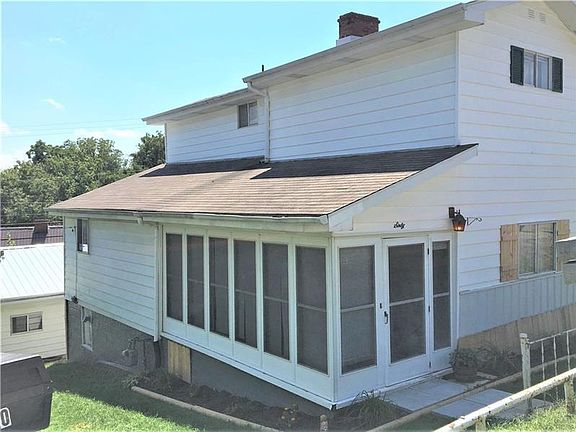 Own a home for less than renting. Approximate mortgage payment is $600. Convenient location - 1 minute from Rt 40 and 3 miles from I79. Bright, NEWLY painted kitchen cabinets with NEW counter tops. NEWER appliances. Kitchen measures 10x19. The dining area (8x9) has NEW carpet tile. There is a delightful sun room (8x16) off of the large eat-in kitchen. Room off kitchen can be used as formal dining room or a living room and has a sliding glass door that opens to a 7x14 deck. The other room on the main level can be used for a living room or additional bedroom. Master bedroom has 2 closets. NEW doors on all closets. Bathroom has NEW sink and shower surround. NEW wood grain laminated flooring throughout the entire house. Electric UPDATED in 2018. NEW hot water tank. A NEW metal roof covers the 2 car detached garage (21x24). Walking distance to Billy Bell Park.