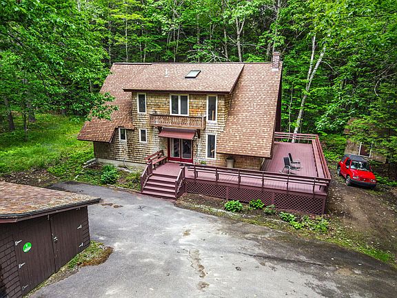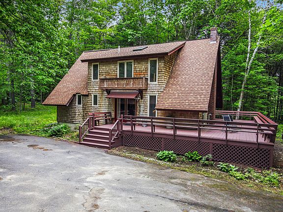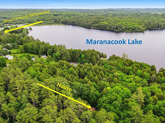 Chalet style with an open interior, vaulted ceiling, lots of glass and natural light and so close to Maranacook Lake that you can hear the loons and boats. The first floor has two bedrooms, office, laundry room and a full bath, and the second floor has two bedrooms, full bath and office or TV loft. Private setting, sweeping open air deck, lots of walking or biking space and convenient to downtown and on 2 wooded acres with great walking & biking opportunities along the lake. The large detached garage could be perfect for not only your car but workshop, or to restore that vintage auto. New front door installed since photos.