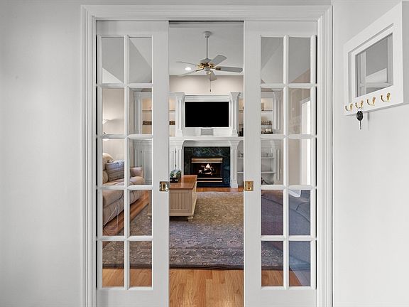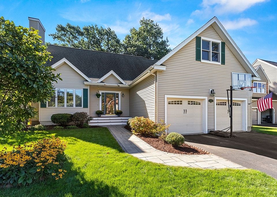 Exquisite custom cape offers single level living modern elegance and timeless charm with hardwood floors throughout. The fully renovated kitchen with quartz countertop and stainless steel appliances is filled with natural light, creating a bright and welcoming atmosphere, perfect for culinary enthusiasts. It flows seamlessly into a cozy family room, adorned with custom bookcases, a gas fireplace, pocket doors and a large picture window. Enjoy year-round relaxation in the bright and airy sun room with views of beautifully landscaped grounds and of the 14th fairway at Bradford Country Club. The first-floor primary suite offers the convenience of single-level living while the second floor boasts three spacious bedrooms and a versatile 25x18 great room above a two-car garage, ideal for entertaining or additional living space. The lower level features a private home office and a bonus room, offering even more space for work and play. A must-see gem in a sought-after location!!
