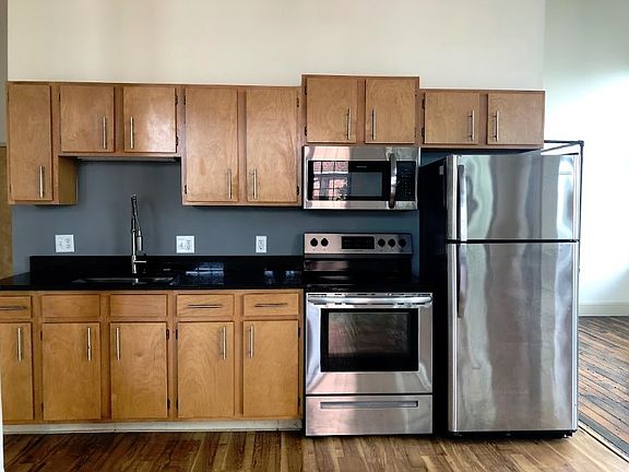 This corner unit studio is massive! The upgraded kitchen features stainless steel appliances and granite countertops. Industrial-styled built-ins give you a bar counter in the kitchen and an open-concept closet in the "bedroom" space. The many windows line 2 sides of the apartment.