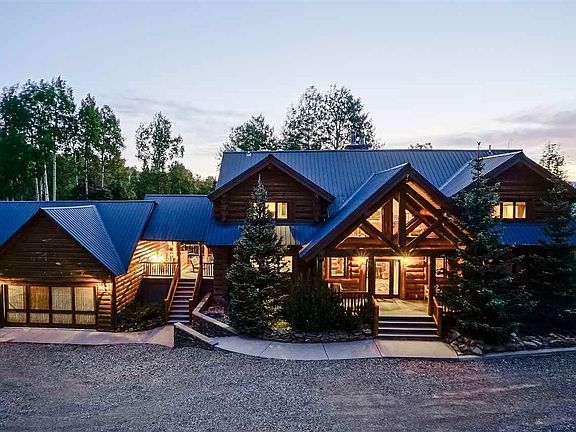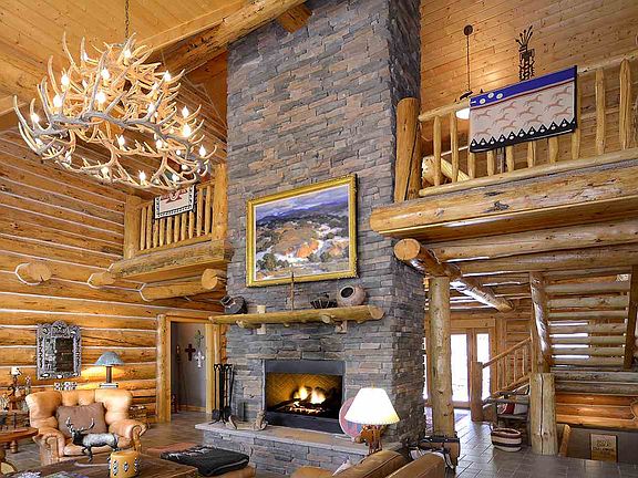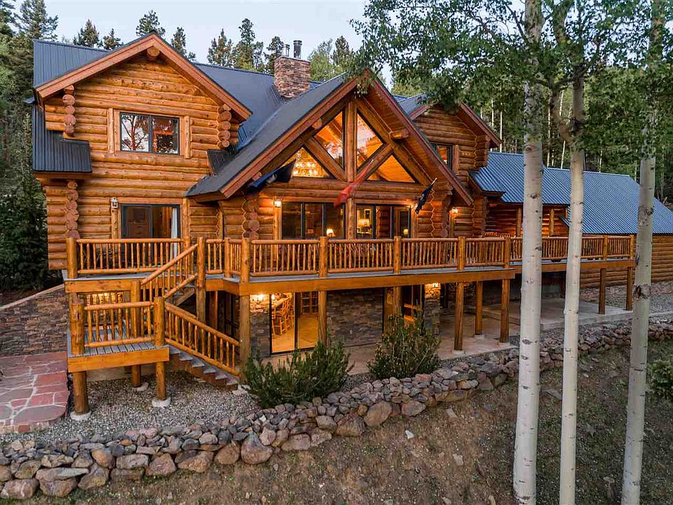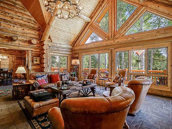 This beautiful log home located on 5 acres in Angel Fire Resort's premier subdivision, "The Aspens". This 3 story log home has a master suite on the ground level along with the entry, half bath, main living area with massive rock fireplace and vaulted ceilings, dining area and gourmet kitchen. The upper level has another living/TV area with a bedroom, full bath ,and another master suite. The lower level has 2 more bedrooms, a bath, another living/TV area with fireplace and a great den/entertaining area with it's own bar. Good views and lots of outdoor living with decks and a covered porch area with an outdoor fireplace between the main house and the 3 car finished garage. Circular driveway accessing the southern exposure garage and main entry on ground level. Elk, deer, and other wildlife sightings are a daily occurrence in the area. Walking distance to Carson National Forest. This home has to be seen to be fully appreciated.