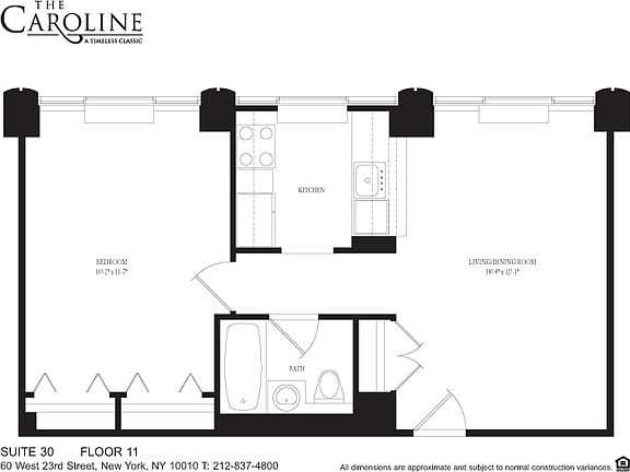 The Caroline is a beautifully appointed, 22-story white glove residence located at 60 West 23rd Street in Chelsea. Since construction was completed in 2002 the building has cemented its reputation as one of the most prestigious rental buildings in New York City. All 431 apartments feature open living spaces with abundant closets, over sized windows, marble bathrooms, and open kitchens with stainless steel appliances, including dishwasher, microwave, and full-size refrigerator and freezer. Many units also have a private outdoor space. The building offers a superb amenity package that includes a 24-hour doorman, concierge, tenants lounge, children's game room & 12,000 sq. ft. landscaped roof deck and courtyard with formal European garden. The building is attached to the New York Health & Racquet Club, of which there is a 44,000 sq ft one on site with a saltwater pool, state-of-the-art equipment, 500 classes per week, and much more. New tenants receive a complimentary gym membership for their initial lease term. Photos and floor plans are of a representative unit. Prices and incentives are subject to change.