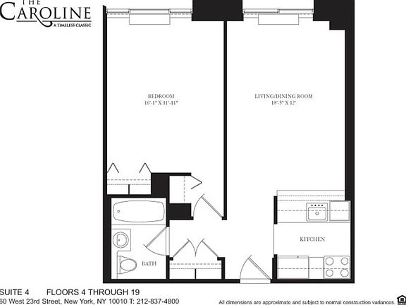 High-floor one bedroom now available at The Caroline, which is a beautifully appointed, white glove building located on 23rd and 6th, where Flatiron meets Chelsea! 1404 faces north towards 23rd street. Light strip hardwood floors run throughout the apartment, which also features generous closet space in the common area and bedroom. The pass-through kitchen has ample cabinet space and features stainless steel appliances including a full-size gas range, dishwasher and microwave. The bedroom can accommodate a king-sized bed, and the apartment's temperature is controlled via Nest thermostat. Our new on-site membership-based 40,000+ sq ft fitness facility, Life Time 23rd Street, has an indoor saltwater pool, over 90 classes per week taught by New York's top instructors, a world-class cedarwood sauna, eucalyptus steam room, and luxuries like premium toiletries and full towel service. The Caroline, designed by Richard Cook and Costas Kondylis, is a beautifully appointed, 22-story white-glove residence in close proximity to Madison Square Park, at the intersection of New York City's vibrant Chelsea and Flatiron neighborhoods. Each home features open living spaces with abundant closets, oversized windows, marble bathrooms, and generously laid out kitchens with full-sized stainless steel appliance packages, granite countertops & floors. Select residences feature 10-foot ceiling heights, walk-in closets, floor-to-ceiling windows, private terraces, washer/dryers, strip hardwood flooring, and NEST climate control systems. Extra care was put into soundproofing wall and floor insulation during construction. The building offers a superb amenity package that includes a 24-hour doorman, resident concierge, on-site valet for dry cleaning, tailor, a shoeshine station, tenant lounge, children's playroom, arcade, billiard parlor, private meeting facilities with outdoor space, 12,000 SF landscaped roof deck, a commercial sized laundry room with 50+ machines and an immaculate interior courtyard with formal European garden. Resident events range from live music and rooftop BBQs to Sunday brunch and varied events for kids, all complimentary to residents. Bike room, parking spaces, and storage cages are available for rent upon availability and request. Parking has secure elevator access directly to select residence floors. Electric vehicle charging is also available. Photos and floorplans are representative and approximate, pricing subject to change. Smoking allowed:No
