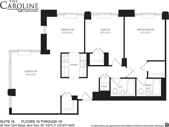 Huge new 2 bedroom, 2 bathroom apartment with dining room in Chelsea's best building, The Caroline. Features include gorgeous dark strip hardwood floors, solar shades, washer/dryer in the unit, 2 queen sized bedrooms, abundant closet space, a marble bathroom, and a fully equipped kitchen with stainless steel appliances, including a dishwasher, microwave, and full-size fridge & freezer. The Caroline is a beautifully appointed, 22-story white glove residence located at 60 West 23rd Street in Chelsea. Since construction was completed in 2002 the building has cemented its reputation as one of the most prestigious rental buildings in New York City. All 431 apartments feature open living spaces with abundant closets, over sized windows, marble bathrooms, and open kitchens with stainless steel appliances, including dishwasher, microwave, and full-size refrigerator and freezer. Many units also have a private outdoor space. The building offers a superb amenity package that includes a 24-hour doorman, concierge, tenants lounge, childrens game room & 12,000 sq. ft. landscaped roof deck and courtyard with formal European garden. Listed rent is net effective, based on a gross rent of $6,365 and 1 Month Free Photos and floor plans are of a representative unit. Prices and incentives are subject to change.