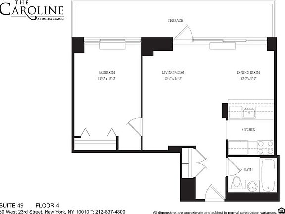 Gorgeous internal garden facing unit with balcony and dining alcove in The Caroline, a beautifully appointed, 22 story 'white glove' residence located at 60 West 23rd Street in Chelsea. Since construction was completed in 2002 the building has cemented its reputation as one of the most prestigious rental buildings in New York City. All 431 apartments feature open living spaces with abundant closets, over sized windows, marble bathrooms, and open kitchens with stainless steel appliances, including dishwasher, microwave, and full-size fridge & freezer. Many units also have private outdoor space. The building offers a superb amenity package that includes a round the clock doorman, concierge, brand new tenants lounge, children's game room & 12,000 sq. ft. landscaped roof deck and courtyard with formal European garden. Photos and floor plans are of a representative unit. Prices and incentives are subject to change.