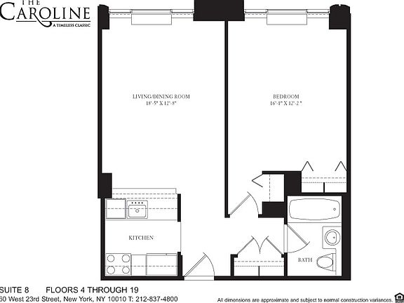 The apartment features a large living space, abundant closet space, oversized windows, a marble windowed bathroom, and an open kitchen with stainless steel appliances, including a dishwasher, microwave, and full-size fridge & freezer. The Caroline, which is a beautifully appointed, white glove building located on 23rd and 6th, where Flatiron meets Chelsea! It features a spacious living room and two king-sized bedrooms. The kitchen faces the living area, has ample cabinet storage space and features stainless steel appliances including a full-size gas range. The unit also has generously sized closets. The Caroline offers a superb amenity package that includes a 24-hour doorman, concierge, tenant lounge, children's game room, breathtaking 12,000 sq. ft. landscaped roof deck, and courtyard with formal European garden. Since construction was completed in 2002, The Caroline has cemented its reputation as one of the most prestigious rental buildings in New York City. Virtual tours available 7 days a week. * Listed rent is net effective, based on a gross rent of $3,814 and 1 Month Free Photos and floor plans are of a representative unit. Prices and incentives are subject to change.