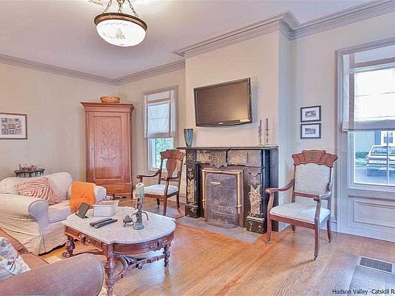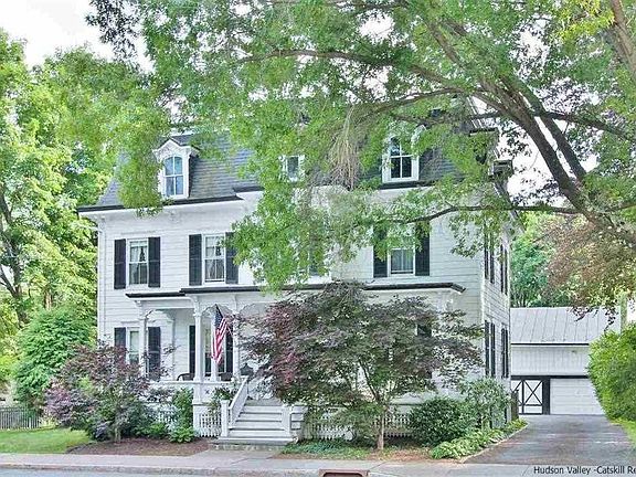 French design bursts from this Second Empire home, a true masterpiece from the Victorian era. Regally sited & tastefully preserved, this Village home offers endless possibilities. A warm vestibule greets with antique tile finishes & massive, bold, double French doors. Distressed wide board floors sparkle in the days light as you meander the 1st floor. Rooms are nicely accented with stepped crown moldings & antique marble fireplaces. Decorative brackets & cornices accent the exterior flowing from the mansard roof. The bright & airy kitchen is flooded with Cherry cabinets, stainless appliances, double ovens & Soapstone counters offer modernized comfort. Half bath on the first floor is plumbed for a full bath and is now the second laundry room, two 2nd floor baths have been completely renovated in recent years boasting sleek subway tile, walk-in shower in the master and a tub/shower in the hall. Full walk-up attic has has a multitude of uses, an artists dream with wide open plan &soaring ceilings.