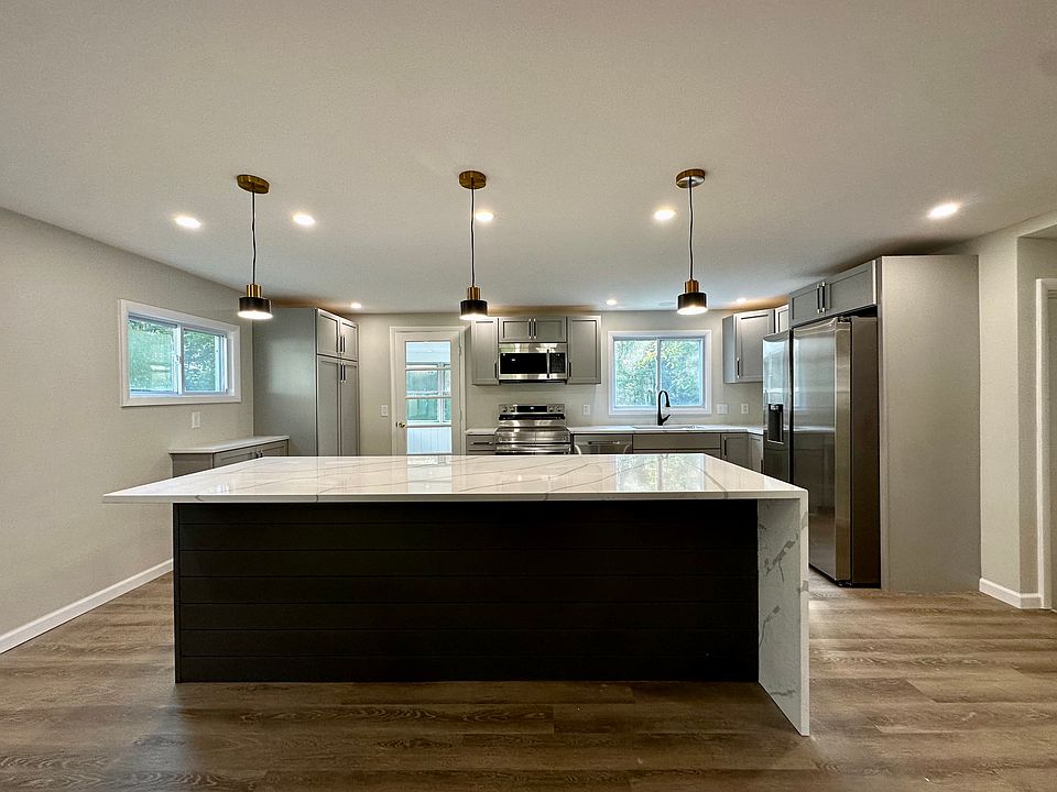 * Modern Kitchen and bathrooms: Features new sleek appliances, ample quartz counter space, lots of storage space in pantry and cabinets, plenty of natural light.