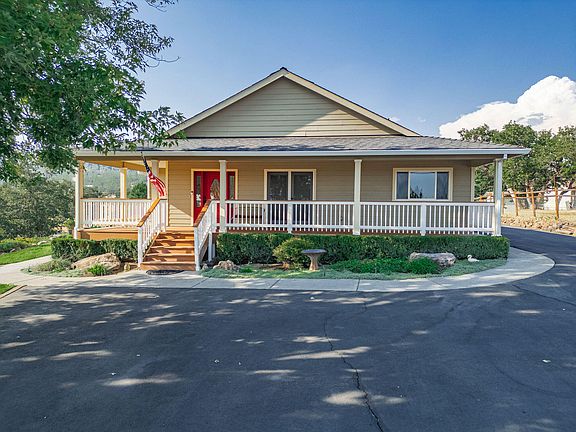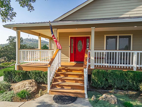 Stunning 2,242 SF custom home on 5 fully fenced acres with breathtaking panoramic mountain views! This 3BD/2.5BA beauty showcases vaulted ceilings, hardwood, tile & plush carpet throughout. The open kitchen features granite counters, stainless appliances, & plenty of storage. Extra pantry in the hall. The spacious primary suite offers a walk-in closet, double vanity, & a luxurious walk-in shower. French doors, granite counters throughout, & thoughtful design create comfort & elegance. Relax or entertain on the covered deck or lower deck with views in every direction. A large fully fenced garden with she-shed (Has power & water close) adds charm & function. Property also includes an additional 2-car garage for storage. Fruit & nut trees on drip system,2 2,500-gal concrete holding tanks plus above-ground tank, & sprinklers to irrigate all 5 acres. Alarm on septic, wired for generator, & Starlink internet included—offering the perfect mix of modern convenience & country living!