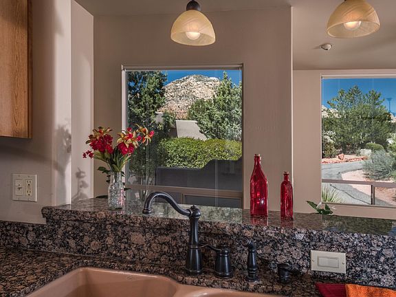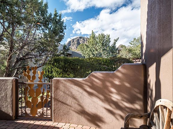 Single level, Santa Fe pueblo style home in a private & secluded location in the heart of W Sedona, in upscale Crimson View. Conveniently close to goods & services. Built in 2004, 3BD/3BA, 2082sf, w/large great room & views of Thunder Mtn. Lots of natural light, high ceilings and peaceful atmosphere with roof deck possibilities. New carpet in bedrooms and each bedroom suite has patio access. Upgrades throughout, granite counter tops, kitchen cabinets, stainless steel appliances, 18'' tile, gas fireplace, walled front courtyard w/kiva fireplace, private covered patio & open deck in back, brick paver driveway w/side entry 2 car garage. 2017: roof re-coated & exterior repainted. Appraised at $660k in 2017! Located next to common space for even more privacy. Nature abounds. Mature landscaping.