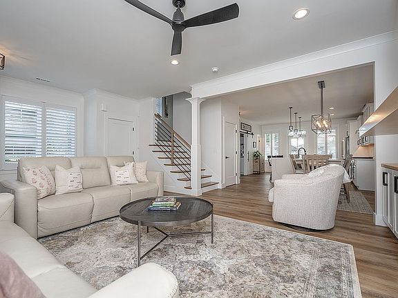 Inside, the open-concept design is filled with luxury touches. Wide-plank LVP flooring flows throughout two levels, enhanced by ceiling fans and LED recessed lighting. The Family Room centers around a sleek linear gas fireplace with plantation shutters, while the Dining Room is highlighted by a modern chandelier.