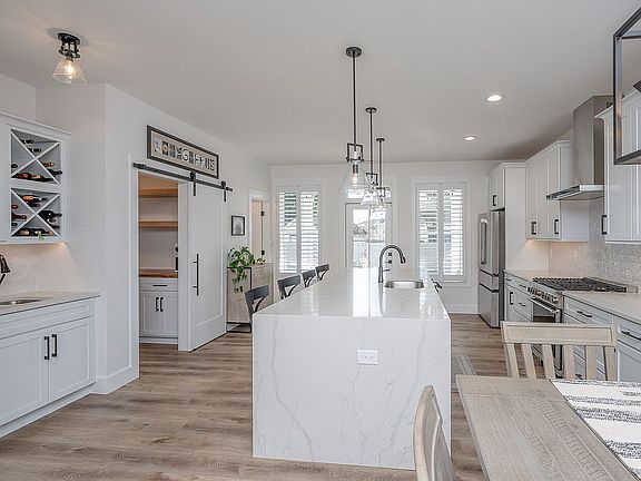 The chef’s Kitchen boasts a waterfall quartz island, designer backsplash, abundant cabinetry, Electrolux appliances, wet bar with wine storage, and a custom Pantry with floating shelves and butcher block counters. A stylish Half Bath completes the main level.
