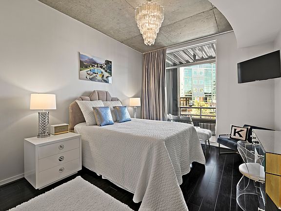 The open-concept design showcases a sleek kitchen with new appliances, polished concrete floors, and an easy flow for entertaining. Step onto your spacious private balcony—perfect for morning coffee or evening cocktails while taking in the vibrant skyline.