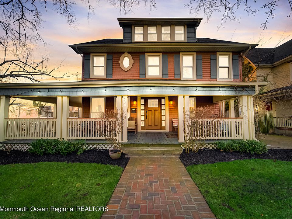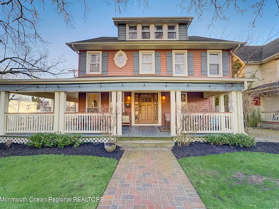 Welcome to this magnificent and inviting shore colonial that has been lovingly renovated with all of today's modern amenities while retaining its charm and character! Located just blocks from the beach, boardwalk and historic music venues sits this light and bright, 8 bedroom, 4 1/2 bath home with a wraparound porch and 3 levels of exquisite living. Upon entering through the front door you will discover warmth and charm with custom accents and wood flooring throughout. An entertainer's dream home with so much space for friends and family with an added bonus of ample income generated from regular guests. The lavish first floor features a den/piano room with a wet bar, a spacious family room with a double-sided fireplace to the large formal dining room that opens to the chef's kitchen with custom cabinets, granite countertops, stainless steel appliances, a pantry and a breakfast bar.. Sliding glass doors provide access to the private fenced-in yard- perfect for an evening BBQ! 1.5 bathrooms complete the main level. The second floor brings you to the main suite with a new designer bathroom featuring double sinks and a soaking tub. There are an additional 3 generous sized bedrooms, a full bathroom and laundry area. The third level has another 3 generous size bedrooms and a full bathroom. Conveniently located with easy access to major roadways and the train station, just blocks to the many restaurants, music venues, boardwalk and fabulous beach!!
