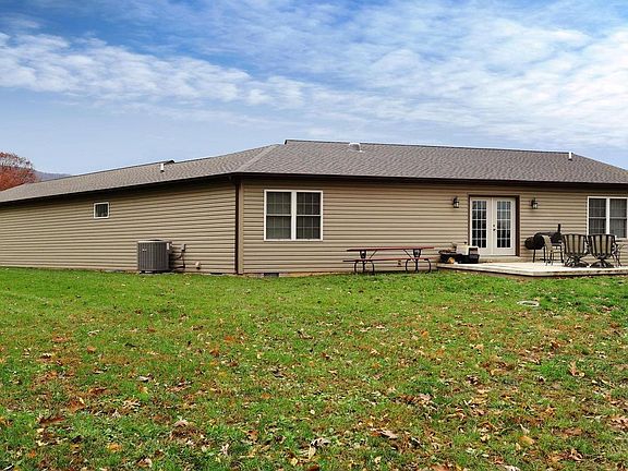 When you open the front door to your new home, your gaze will inevitably move from the hardwood flooring in the foyer to the Open Floor Plan, as the beautiful hardwood flooring continues to the living room, kitchen and dining room.The 24~x14~ living room, which opens thru French doors to the rear patio, shares a cathedral ceiling with the kitchen area. The large kitchen island offers additional workspace for the family chef, as well as being a gathering place for family and friends. Stainless Steel energy-efficient appliances compliment the granite countertops, custom KraftMaid birch wood/cherry finish cupboards, solar tube and upgraded lighting.The 14~x12~ dining room, with ample room for special china/dinner furniture is the final piece of this open floor plan.To the left of this living room/kitchen/dining room area are the bedrooms. The 16~x12~ Master Bedroom includes carpeting and walk-in closet, and flows to the Master Bath, which has a double vanity and ceramic tile flooring. The two additional bedrooms and second full bath complete this area of the home.The 14~x7~ laundry area, to the right of the dining room/kitchen area, offers additional storage space, and also serves as a mud room when entering your home from the three car oversized attached garage. The spacious partially finished basement can be easily upgraded for additional living space. All this on 2.06 acres, with mountain/pastoral views. This home has been lightly-lived-in since the completion of construction in 2016. It is move-in ready, and waiting for you.