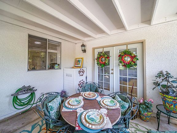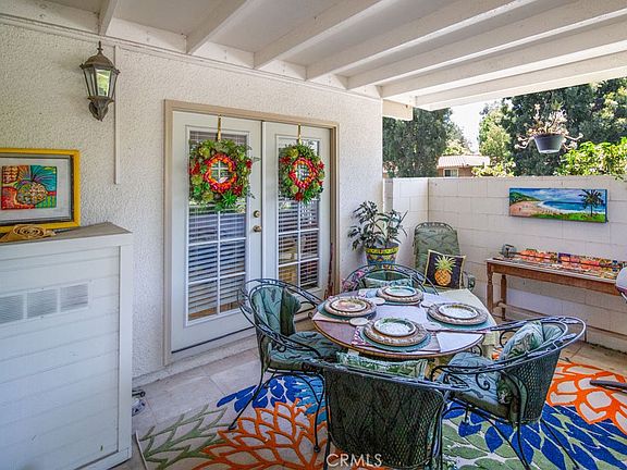 Charming remodeled end-unit single-level two-bedroom, two-bath GRANADA floorplan in the Laguna Woods senior community. This residence sits on a small bluff with a lovely tree-filled neighborhood view. Exquisite landscaping along the path leading to the front door provides excellent curb appeal. The double front doors open to reveal a large living room/dining room area. The living room features a vaulted ceiling and an extra window (available only in end-unit Granada’s) which brings extra light into the room. Just off the dining area through sliding glass doors is a private atrium – a small intimate outdoor space for dining or relaxing. Sunlight streaming through the windows of the atrium brightens the dining area, guest bedroom and hallway. The kitchen was redesigned to open up to the living room and features upgrades including newer wood cabinetry, recessed lighting and a solar tube that brings in natural sunlight throughout the day. The dishwasher and microwave are brand new. One wall of the primary bedroom has been reconfigured to add additional closets with folding doors as well as a vanity. A set of French doors in the primary bedroom open to the covered front patio. This patio is the perfect outdoor spot is year-round entertaining, dining or relaxing. The guest bedroom could also serve as an exercise room, arts and crafts workshop or home office. The guest bathroom features a skylight and tub/shower combo. A stackable washer/dryer is conveniently located in a hall closet. The wall heating/cooling units in the living room and primary bedroom were replaced in recent years as were the gutters, downspouts and water heater. The exterior of the building was freshly painted about two years ago. There are no steps from the front door to the nearby assigned carport which has both upper and lower storage cabinets. There is ample guest parking in the cul-de-sac. Do not miss this gorgeous property!