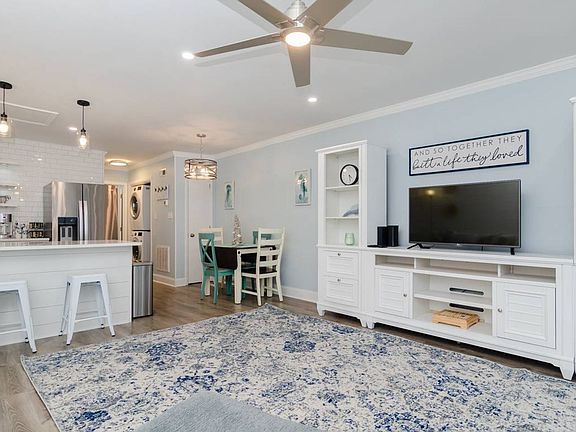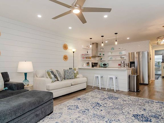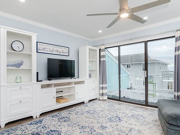 As you enter the condo you are instantly greeted by the bright airy space. The open floor plan maximizes the ocean views and creates a fantastic gathering space. Subway tiles and open shelving line the crisp kitchen and are perfectly accented by the quartz counter tops, stainless steel appliances, and teal touches. The living room is lined with shiplap and beautiful hues of blue that seamlessly blend the views with the interior of this home. There is a deck off the living room that overlooks the ocean.