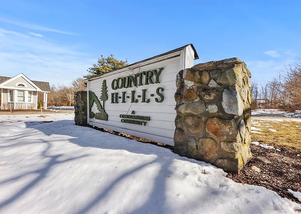 Tucked away in a serene country setting,this 2-bed, 2-bath townhouse condo offers the perfect blend of rural and urban convenience. Country Hills is conveniently located off Route 140 and minutes away from highways, shopping centers, restaurants and approx. 1.6+ miles from the new T station. The floor plan of this corner unit exudes a welcoming atmosphere perfect for entertaining. The 1st level consists of the living room with a wood burning fireplace & vaulted ceiling; the dining area with cathedral ceiling, lots of natural light from the oversized windows & access to the deck; the  kitchen with SS appliances & granite countertops, plus a bedroom w/a huge walk in closet, full bath & laundry area, Upstairs, the primary bedroom suite has a full bath, loft, walk in closet, & access to a 2nd covered deck overlooking a beautiful wooded area.Need more room?The basement offers plenty of storage & offers potential for additional finished area. 1st showings at Open House Saturday 2/24 11-12:30