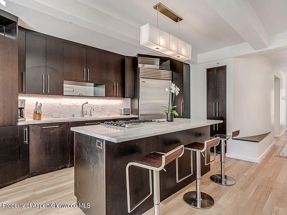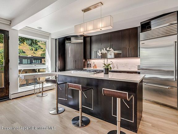 C-1 zoning allows for unlimited STR's! Top floor core condo looking right at Aspen Mountain. Remodeled 2 bed, 2 bath, garage, elevator and deck on the 4th floor with stunning view of Aspen Mountain! Hardwood floors, beautiful kitchen with a gas stove, subzero fridge, beautiful bathrooms, gas fireplace, air conditioning, freshly painted interior. 4 short blocks to the Gondola.