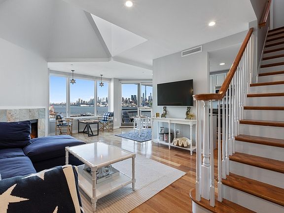 Discover luxury waterfront living in this North facing, 2 Bed + Den 2 Full Bath duplex home located in the prestigious Riva Pointe. This 1,365 sqft home features stunning views of NYC & the Hudson River, wood flooring throughout, a wood-burning fireplace and a private balcony opening to the living and dining area making it perfect for entertaining. The chef-inspired kitchen features SS appliances, granite counters & a breakfast bar overlooking the water views. The first floor bedroom ensuite features a walk-in closet, access to the bathroom, and large windows. Travel to the second floor, to your private oasis featuring the master suite & large den w/views of NYC & the Hudson River. Access the closet & storage space w/an updated bathroom & a separate jacuzzi tub/shower, down the hall. In-unit W/D and 1 car garage parking completes the home. Riva Pointe features 24/7 concierge, gym w/yoga studio, indoor swimming pool, directly access to the NY Ferry, Whole Foods, & so much more!