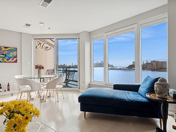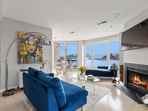 Experience the epitome of waterfront living in this one-of-a-kind, sun-drenched condo, featuring an expansive terrace and private balcony perfect for summer entertaining with breathtaking views of the iconic NYC skyline as your backdrop. This meticulously updated one-bedroom, one-bath home boasts a brand-new kitchen with a chic backsplash, sleek countertops, and top-of-the-line appliances. Brand new wood floors throughout the space, with cozy wood-burning fireplace. The unit includes a newly installed front-loading washer and dryer, fresh paint throughout, updated sliding doors and stylish Levolor window treatments. One garage parking space is included. Amenities include a state-of-the-art fitness center, an indoor heated pool, guest parking, and 24-hour concierge service. Situated in the most sought-after waterfront location. Whole Foods, the NYC Ferry, Light Rail, and bus services. Living here truly feels like vacation every single day! This unit can be sold fully furnished.